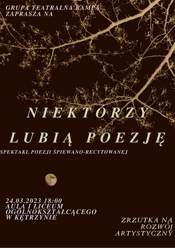 W związku z tym szkolna grupa teatralna - "Rampa" zdecydowała się przygotować spektakl poezji słowno-recytowanej Naszej noblistki. Opatrzony tytułem jednego z utworów poetki - "Niektórzy lubią poezję" występ odbędzie się 24 marca 2023 roku o godzinie 18.00 w auli I Liceum im Wojciecha Kętrzyńskiego w Kętrzynie. Przy okazji spotkania umieścimy na sali puszki - zebrana dzięki darczyńcom suma pozwoli nam na dalszy rozwój działalności artystycznej. Dzięki waszemu wsparciu będziemy mogli dzielić się naszą pasją z innymi!