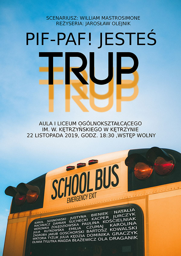 22 listopada na deskach naszej Auli mogliśmy zobaczyć spektakl „Pif-paf jesteś trup!” w wykonaniu aktorów z naszej szkolnej grupy teatralnej „Rampa”. Publiczność dopisała, sala była wypełniona po brzegi. W pewnym momencie musieliśmy nawet rozkładać dodatkowe krzesła. W końcu światło zgasło i rozpoczął się spektakl. Emocje, historia, stroje, gra aktorów … wszystko zagrało jak należy. Po minach i wzruszeniu widzów można było wywnioskować, że przedstawiana historia dotarła do nich. Po spektaklu były owacje na stojąco, gratulacje, rozmowy.