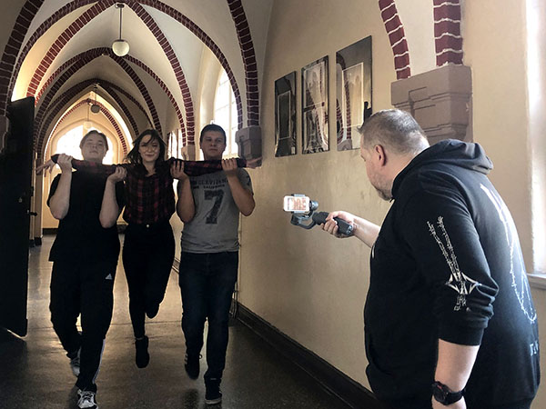 Warsztaty składały się z dwóch części. Pierwsza z nich była dla nas niespodzianką przygotowaną przez naszego gościa oraz Pana Jarosława Olejnika. Mieliśmy okazję stworzyć wspólnie teledysk do piosenki „Sobie i Wam” tegorocznego Męskiego Grania. Nasz gość udzielił nam kilku rad związanych z pracą z kamerą, co dodało nam pewności siebie przy tworzeniu wspólnego dzieła. Każdy z nas miał konkretne zadanie i swoją rolę, a wspólnie komponowały się one w spójną całość. Pan Marcin nagrywał nas ujęciem mastershot, nieprzerwanym żadnym cięciem ani montażem, więc musieliśmy być bardzo skoncentrowani. Jednocześnie dobrze się przy tym bawiliśmy. Oglądając ostateczną wersję nie mogliśmy powstrzymać się od śmiechu. Bardzo się cieszymy, że mogliśmy mieć możliwość nakręcenia takiego teledysku i bardzo za to panu Marcinowi i panu Jarkowi dziękujemy.