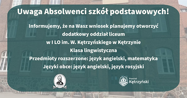 Informujemy, że na Wasz wniosek planujemy otworzyć dodatkowy oddział liceum w I Liceum Ogólnokształcące im. W. Kętrzyńskiego w Kętrzynie ![]()