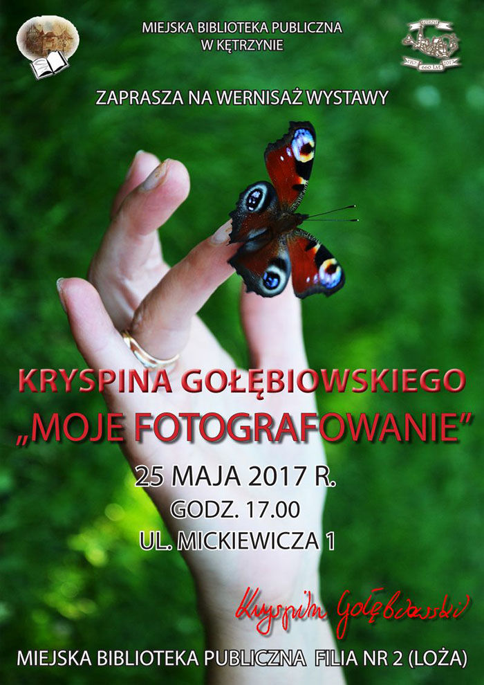 Zapraszam na wernisaż wystawy Kryspina Gołębiowskiego pt. "Moje fotografowanie", ucznia, a już prawie absolwenta ZSO im. Wojciecha Kętrzyńskiego w Kętrzynie. Wernisaż odbędzie się w MBP Filii nr 2 (Loża), 25 maja br., o godz. 17.00.