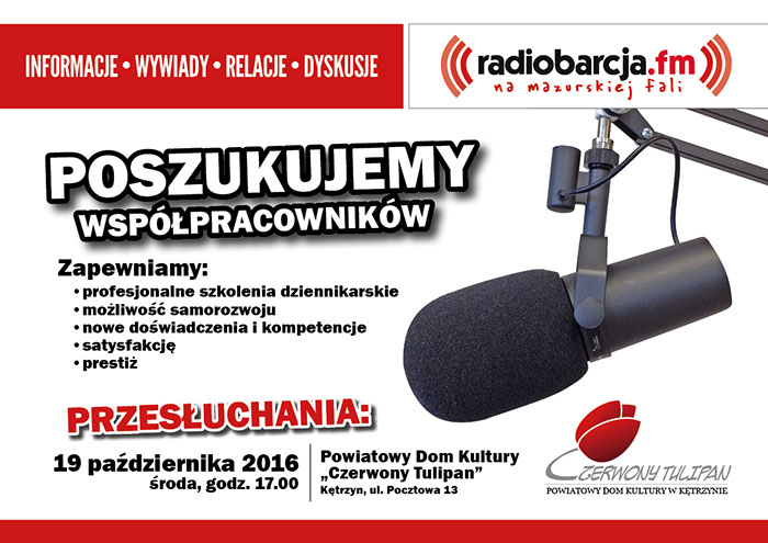 Chcesz wtopić się w niezwykłą atmosferę radia, poznać ciekawych ludzi, nauczyć się kunsztu dziennikarskiego, a nawet prowadzić swój program na antenie? W Powiatowym Domu Kultury „Czerwony Tulipan” przy ul. Pocztowej 13 organizujemy przesłuchania. Może to właśnie ty zostaniesz głosem Radia Barcja.