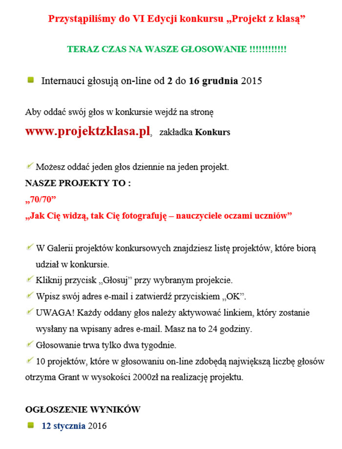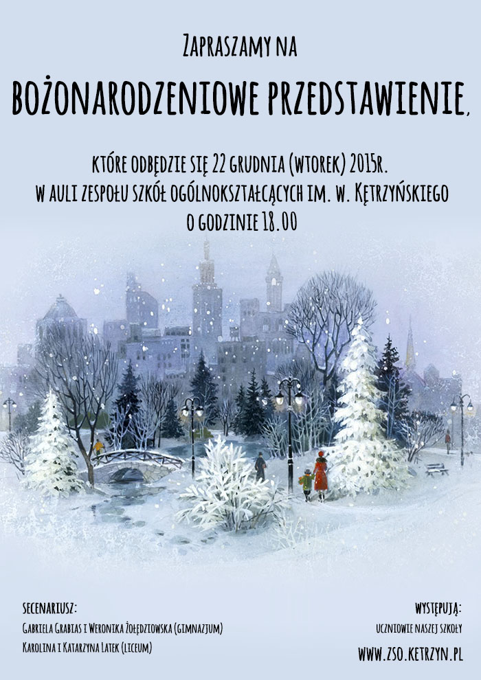 Zapraszamy na bożonarodzeniowe przestawienie, które odbędzie się 22 grudnia 2015 r. w auli szkoły o godzinie 18.00. Tym razem autorami scenariusza są uczniowie: gimnazjum – Gabriela Grabias i Weronika Żołędziowska oraz liceum – Karolina Latek i Katarzyna Latek. Wiele inspiracji i pomysłów zawdzięczamy panu Darianowi Wiesnerowi, który służył aktorom fachową pomocą. Wystąpią zarówno uczniowie gimnazjum, jak i liceum.