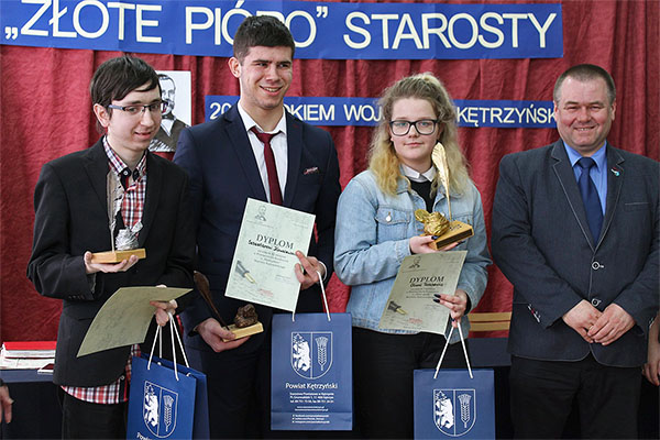 Dnia 14 marca w Zespole Szkół im.M.C.Skłodowskiej po raz piąty odbył się Powiatowy Konkurs Ortograficzny o „Złote Pióro” Starosty Kętrzyńskiego. Po eliminacjach szkolnych, naszą szkołę reprezentowali Antonina Kaliszewska, Katarzyna Pawłowska, Patrycja Porębska, Emilia Pusio, Oliwia Tarasewicz oraz Tomasz Zarzecki. Naszą powiatową klasówkę pisało ok.30 osób. Organizatorzy przygotowali trudny tekst dyktanda, tematycznie nawiązujący do patrona miasta Wojciecha Kętrzyńskiego. Po napisaniu dyktanda przez Uczestników i sprawdzeniu go przez Organizatorów, przyszedł czas na ogłoszenie wyników. Najważniejszy tytuł Mistrza Ortografii i „Złote Pióro” Starosty zdobyła uczennica kl. II d liceum Oliwia Tarasewicz! Nagrody i dyplomy wręczał Starosta Kętrzyński Pan Jarosław Pieniak, gratulując wszystkim uczniom znakomitych zdolności ortograficznych.