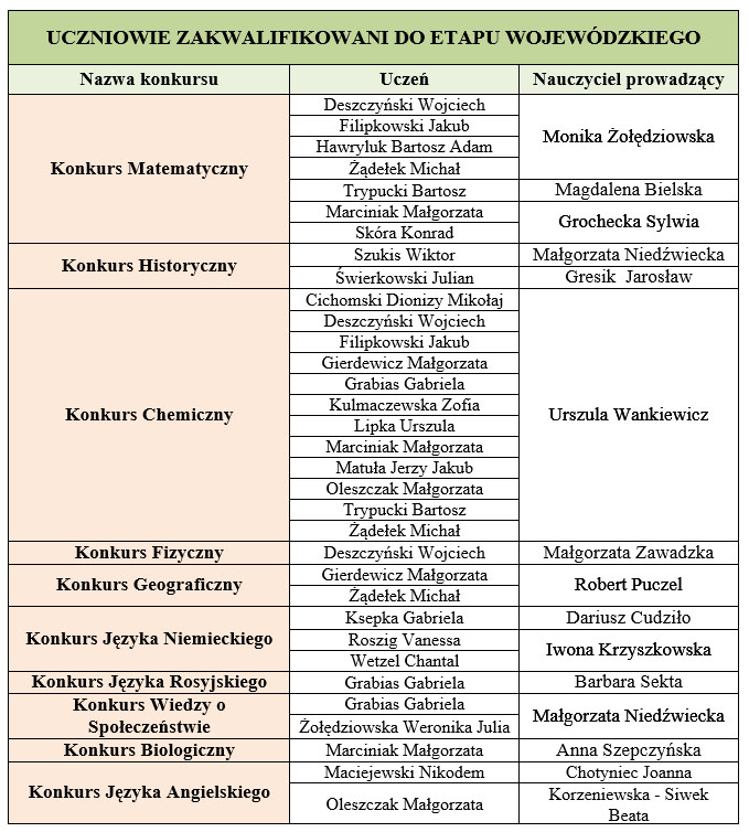 O tytuł laureata wojewódzkiego konkursu przedmiotowego będzie walczyć w lutym 2017r. 21 osób. W trzech konkursach wystartuje Wojciech Deszczyński, Michał Żądełek, Małgorzata Marciniak, Gabriela Grabias. W dwóch konkursach: Jakub Filipkowski, Bartosz Trypucki, Małgorzata Gierdewicz, Małgorzata Oleszczak.