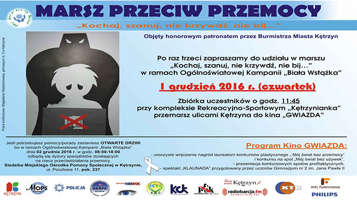 Dnia 1 grudnia 2016 roku klasa 3a gimnazjum wraz z wychowawcą uczestniczyła w marszu przeciwko przemocy. Spotkaliśmy się przy basenie i dostaliśmy balony. Wyruszyliśmy z parkingu obok basenu, przeszliśmy obok szpitala i dotarliśmy do kina. W marszu uczestniczyli także uczniowie z innych szkół. W kinie zostały przyznane nagrody dla zwycięzców konkursów o tematyce „Stop przemocy”. W kategorii gimnazjum nagrodę otrzymały uczennice z naszej szkoły: