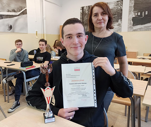 W dniu 12 kwietnia 2022r. uczeń Pani Małgorzaty Niedźwieckiej z kl. II c Ksawery Kalinowski-Wanago uzyskał tytuł finalisty w etapie centralnym Olimpiady Wiedzy Historycznej COPTIOSH.