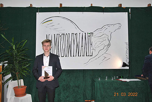 21 marca 2022 roku w Zespole Szkół im. Gen. Mariusza Zaruskiego w Węgorzewie odbył się wieczór poetycki będący zwieńczeniem Międzynarodowego Konkursu Poetyckiego Namuzowywanie. Jakub Sieńko - uczeń klasy 1c, reprezentował naszą szkołę jako młody poeta wyróżniony w tym konkursie. Spotkanie przebiegało w niezwykle uroczystym i lirycznym nastroju. Widzowie mogli wysłuchać nagrodzonych wierszy w interpretacji samych twórców. Wieczór urozmaiciły piękne aranżacje utworów muzycznych.