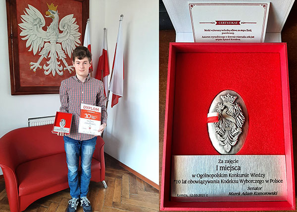 Nie tak dawno pisaliśmy o pięciokrotnym sukcesie w olimpiadach historyczno – wosowych, a dzisiaj możemy cieszyć się z jeszcze większego zwycięstwa. W ostatni dzień marca Wiktora Szukis, uczeń pani Małgorzaty Niedźwieckiej, brał udział w kolejnej olimpiadzie. Tym razem sprawdzano wiedzę z zakresu znajomości Kodeksu wyborczego oraz Konstytucji RP. Wiktor okazał się najlepszy w Polsce. Zajął I miejsce w kraju!!! W ostatnim, kluczowym etapie konkursu udział wzięło ponad 100 uczniów z całej Polski. Do etapu ustnego przeszło jedynie 10 uczestników. Przewodnicząca Komisji, oceniając wypowiedzi laureata I miejsca, opisała sukces jako bezapelacyjne zwycięstwo. Z tego powodu jesteśmy dumni z Wiktora oraz składamy wielkie gratulacje.