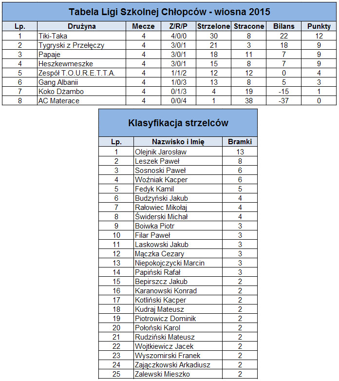 W pierwszym meczu spotkały się drużyny z dwóch krańców tabeli. Materace marzyły o strzeleniu pierwszego gola, a Tiki – Taka o zmazaniu niedobrego wrażenia po trzeciej kolejce. Materace osiągnęły swój cel – w końcu strzeliły swoją pierwszą bramkę! Gratulacje. Strzelcem został Bartosz Trypucki. Natomiast Tiki – Taka (w dalszym ciągu w rezerwowym składzie) mimo strzelenia 10 bramek nie pokazał nic ciekawego. Wiele strat, brak zrozumienia i zaangażowania niektórych zawodników sprawiają, że mimo pierwszej lokaty w tabeli Tiki – Taka spisuje się tragicznie. Mamy nadzieję, że ich gra się poprawi. Doszło również do transferu. Zawodnik Tiki – Taki (Konrad Karanowski) przeszedł do Koko Dżambo. Suma transferu pozostała jednak tajemnicą.