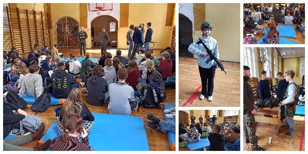 W tym tygodniu uczniowie klas czwartych spotkali się z przedstawicielami Wojskowego Centrum Rekrutacji w Lidzbarku Warmińskim. Goście przedstawili informacje na temat zbliżającej się kwalifikacji wojskowej oraz omówili zasady wstąpienia i służby w szeregach Wojska Polskiego. Poruszyli również tematykę wyższych szkół wojskowych oraz o przebiegu studiów na istniejących tam kierunkach. Nasi goście omówili także działanie Legii Akademickiej. Uczniowie mieli możliwość zadawania pytań dotyczących szczegółów kształcenia wojskowego lub pracy w Wojsku Polskim.