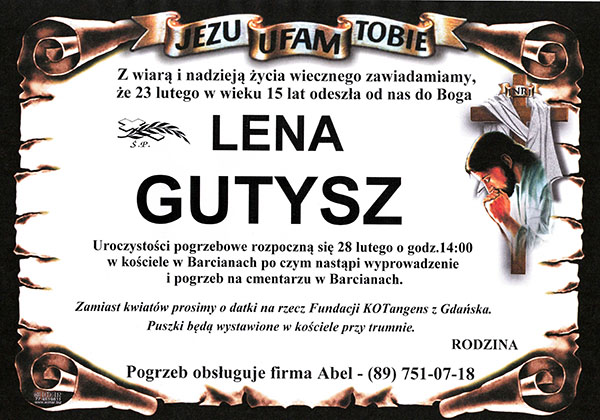 Z głębokim żalem informujemy o śmierci naszej uczennicy i koleżanki Leny Gutysz. Łączymy się w bólu z Najbliższymi