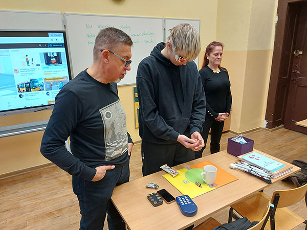 "Przed rozpoczęciem spotkania byłem bardzo ciekawy, jak będzie ono wyglądać, ponieważ niecodziennie możemy spotkać osobę, która jest niewidoma. Sądziłem,, że będzie to zwykłe, nudne spotkanie, a było zupełnie odwrotnie. Po wejściu do klasy przywitała nas pani Ewa. Nie pamiętam, kiedy ostatni raz miałem okazję poznać tak energiczną i sympatyczną osobę, jaką niewątpliwie jest pani Ewa. Podczas warsztatów dowiedzieliśmy się, jak żyją i funkcjonują osoby niewidome oraz z jakich urządzeń korzystają, aby ułatwić sobie czynności wykonywane codziennie, jak np. zrobienie sobie herbaty. Dostaliśmy również maski, którymi zasłoniliśmy nasze oczy i sami spróbowaliśmy wykonać kilka z tych czynności. Bez możliwości zobaczenia tego, co robimy, było to dla nas ciężkie, ale każdemu z nas się udało. Pani Ewa pokazała zwróciła nam również uwagę na to, jak możemy pomóc osobie niewidomej. Wszyscy słuchali z zainteresowaniem i z pewnością każdy z nas wyniósł coś wartościowego z tego spotkania” – mówi Dawid.