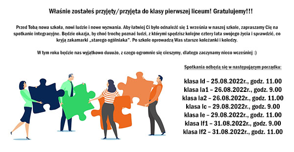 Rozpoczęcie nauki w "starym ogólniaku" niosło za sobą dużo stresu i lęk przed nieznanym. Spotkania integracyjne, które odbyły się w ostatnich dniach sierpnia, rozwiały wszystkie negatywne emocje. Dzięki starszym koleżankom, Pani pedagog oraz nowym wychowawcom przekonaliśmy się, że nie ma się czego bać. Zajęcia przeprowadzone w miłej atmosferze oraz oprowadzanie po szkole na pewno pomogły nam w rozpoczęciu przygody w liceum.