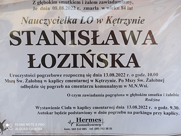 „Laura” kochała poezję. Doskonale ją czując sama pisała wiersze, fraszki, sonety, czy pieśni. Kiedy pod koniec ubiegłego wieku władze naszego miasta rozpisały konkurs na hymn Kętrzyna, propozycja naszej Stasi została wybrana i od wielu lat „Hymn o Kętrzynie” Stanisławy Łozińskiej towarzyszy nam we wszystkich miejskich uroczystościach.