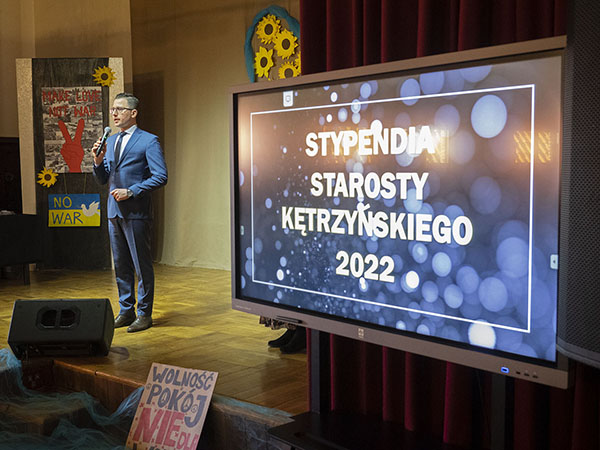 21 marca w naszej szkole już tradycyjnie zwany jest Dniem Młodzieży. Niestety, w ostatnich latach pandemia pokrzyżowała plany i nie dane nam było świętowanie. W tym roku nareszcie wróciliśmy do tradycji, choć w ograniczonym gronie. Wciąż jeszcze obowiązują obostrzenia pandemiczne. Przy tej okazji zostały wręczone stypendia starosty kętrzyńskiego. Najlepsi uczniowie odebrali certyfikaty z rąk pana Michała Kochanowskiego – włodarza powiatu. Jako pierwsi na scenę wystąpili: Kalina Sałyk (3a), Olga Łozowska (1c) i Bartosz Szczurko (3aG) – uczniowie ze średnią 6,0. Następnie pogratulowano i wręczono dyplomy uznania 83 stypendystom.