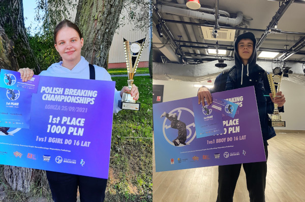 Wiktoria Sławecka i Kacper Myśliwiec to nasi pierwszoklasiści. Na co dzień spokojni i skromni, za to na scenie… petarda! 25 września podczas Polish Breaking Championships Wiktoria została Mistrzynią Polski Bgirl, a Kacper – Mistrzem Bboy – oboje w kategorii do lat 16. I nie myślcie sobie, że zwykły taniec jest – od niedawna breakdance jest oficjalną dyscypliną olimpijską. W zawodach brał również udział Tomek Borowski, Michał Borzuchowski i Szymon Staruch-Wilamowski. Tancerze powalczą o medale olimpijskie już w 2024 roku. Trzymamy kciuki za naszych tancerzy! Może wśród nas są przyszli olimpijczycy :)