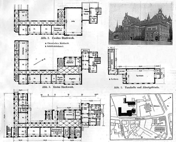Dzisiaj powiadamiamy was o kolejnej perełce. Na niemieckim portalu eBay wypatrzyliśmy oryginalny niemiecki Biulety Centralny Administracji Budowlanej z 29.01.1908 r., który obszernie informuje o budowie, technicznej stronie i szczegółach wyposażenia rastenburskiego gimnazjum. Niezwykle ciekawą częścią publikacji są plany poszczególnych części budynków, dzięki czemu widać, w jakim zakresie następowały w kolejnych latach remonty szkoły, zmieniające jej niektóre pierwotne elementy. Biuletyn zakupiliśmy i nasz nieoceniony nauczyciel języka niemieckiego, pan Dariusz Cudziło, podjął się jego przetłumaczenia. Dzięki temu udało się uzyskać bardzo wiele informacji dotyczących wyglądu szkoły zaraz po jej oddaniu do użytkowania. I tak na przykład ogrzewanie szkoły było parowe, ale w dobudówce mieszczącej mieszkanie dyrektora oraz w sali gimnastycznej funkcjonowały piece. Oświetlenie było gazowe, na drzwiach do klas umieszczono mierniki do ustalania wzrostu uczniów, a na suficie w gabinecie fizycznym namalowano różę wiatrów. Wreszcie wiemy co przedstawiały witraże w oknach auli oraz jakie były pierwotne kolory ścian korytarzy i klas. Absolutnym dla nas zaskoczeniem jest informacja, że na fryzach w holu na parterze „umieszczono niewielkie prezentacje graficzne, np. lis podążający za kurami, trzy kruki itp., podczas gdy nad kranami we wszystkich korytarzach odwzorowano techniką litografii grafiki odnoszące się do życia i wody”!
