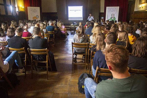 Z takim przesłaniem spotkał się dzisiaj z młodzieżą naszej szkoły Marcin Gienieczko, podróżnik urodzony w Kętrzynie, autor reportaży o sportach ekstremalnych oraz książki „Pokonać siebie”. Było to spotkanie pełne ekspresji, emocji i pasji, okraszone fotografiami z licznych podróży. Pan Marcin zachęcał młodych ludzi, by realizowali swoje pasje i założenia, podkreślał rolę pozytywnego nastawienia do wszystkiego, czego się podejmujemy oraz walki i nierezygnowania, mimo wielu napotkanych przeciwności. Opowieść rozpoczął od swojej pierwszej wyprawy wzdłuż granic Polski, gdy miał lat dziewiętnaście, poprzez kolejne kontynenty. Mówił o ciągłym poszukiwaniu rozwiązań podczas kolejnych podróży, o przewidywaniu sytuacji, walce z bólem, o zagrożeniach ze strony własnego organizmu, który reaguje na ekstremalne warunki. Mówił o poznawaniu ludzi, odkrywaniu tych, na których będzie można polegać, o przyjaciołach, którzy nie zostawiają się w potrzebie, wartościach i zasadzie fair play, którym trzeba być wiernym. Był to przekaz, który przykuł uwagę młodych ludzi, a może sprawił, że u niektórych z nich pojawiły się jakieś postanowienia...