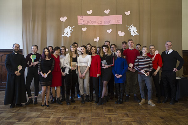 W ostatni czwartek w naszej szkole z okazji Święta Zakochanych oraz przypadającego już za tydzień Międzynarodowego Dnia Języka Ojczystego odbył się finał konkursu recytatorskiego "Szeptem do mnie mów", którego organizatorami byli nauczyciele języka polskiego. W konkursie udział wzięli reprezentanci wszystkich klas gimnazjalnych oraz pierwszych i drugich klas liceum wyłonieni na drodze wewnątrzklasowych eliminacji. Finaliści sami dokonali wyboru prezentowanych utworów, wśród których przeważały wiersze dwudziestowiecznych poetów, ale mieliśmy też po jednym utworze barokowym i romantycznym. Recytacje oceniało pięcioosobowe jury złożone z przedstawicieli grona pedagogicznego, reprezentowanego przez Panią Agnieszkę Jastrzębską i księdza Rafała, oraz wszystkich trzech roczników uczniów. Niektóre prezentacje były tak udane, że jurorom brakowało skali, żeby wyrazić swój zachwyt dla recytatorów, którzy świetnie radzili sobie zarówno z tremą sceniczną, jak i niełatwą materią poezji. Po wysłuchaniu wszystkich utworów i zliczeniu punktów jury w składzie Pani Elżbieta Dżus i Pani Anna Wachnik ogłosiło wyniki. I tak grand prix zdobyła uczennica klasy II D1 Marta Jurgiełajtis, która zaprezentowała wiersz naszej noblistki Wisławy Szymborskiej "Jestem za blisko, żeby mu się śnić". Miejsce drugie zajęła Paulina Niewęgłowska reprezentująca klasę I C liceum, która recytowała utwór Juliana Tuwima "Jesteś znowu". Trzecia nagroda przypadła w udziale Maciejowi Czepułkowskiemu, który zaprezentował nam na scenie minietiudę opartą na utworze Jana Andrzeja Morsztyna "Do trupa". Trzeba jednak podkreślić, że rywalizacja na szczycie była bardzo wyrównana i o ostatecznym kształcie podium decydowały pojedyncze punkty. Poziom prezentacji był naprawdę wysoki, dlatego wszyscy uczestnicy zasłużyli na gorące brawa i słodkie upominki. Laureaci dodatkowo zostali nagrodzeni tomikami poezji. Konkurs uświetniła wschodząca gwiazda polskiej piosenki (wiem, co mówię) Aleksandra Jeznach, która brawurowo wykonała dla nas piosenkę "Szeptem do mnie mów" oraz "Tyle chciałam Ci dać" z repertuaru Mirosława Breguły, udowadniając, że najpiękniejsze wyznania i zaklęcia miłosne wypowiada się zawsze w języku ojczystym.