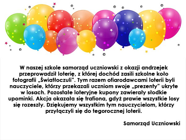 Dziękujemy tym wszystkim uczniom i ich rodzicom, którzy dostarczyli do kawiarenki przeróżne słodkości. Dziękujemy młodzieży i ich pedagogom za włączenie się do naszej mikołajkowej akcji. Szczególne podziękowania składamy uczniom z klas IIIAB i IIICD liceum za organizację dzisiejszego przedsięwzięcia.