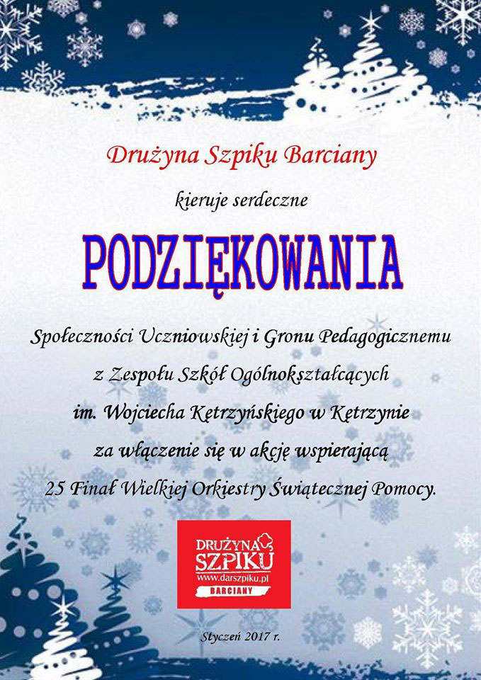 W piątek 13.01.2017 roku w naszej szkole odbył się kiermasz ciast. Cały dochód z niego został przekazany na WOŚP. Możliwość zorganizowania tej akcji była możliwa przez przychylność Pani dyrektor, nauczycieli wspierających, oraz uczniów, którzy bezinteresownie dostarczyli ciasta. Część z nich sprzedaliśmy a reszta została przekazana dla sztabu WOŚPu w Barcianach za sprawą Pani Beaty Korzeniewskiej-Siwej. Cały kiermasz był możliwy dzięki sztabowi w Mrągowie, oraz jego szefowej Pani Alicji Naworskiej-Kotelon, to właśnie stamtąd mieliśmy identyfikatory, puszkę i serduszka. Cały kiermasz przebiegał bez problemów, zarówno nauczyciele jak i uczniowie bardzo pozytywnie odebrali całą akcję i hojnie wspierali szczytny cel.