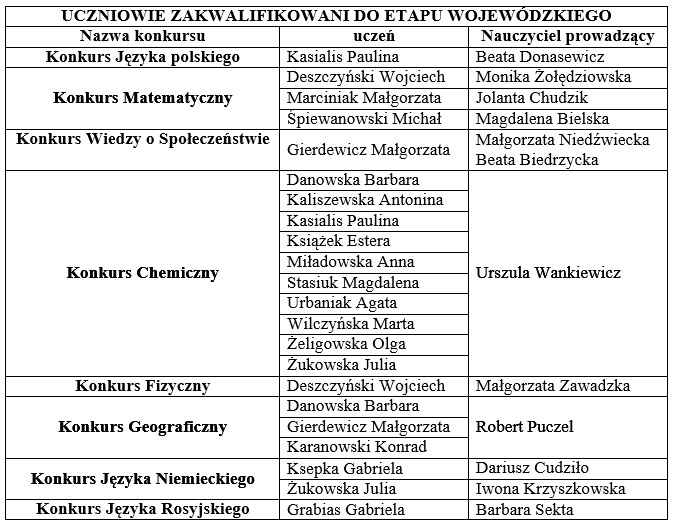 Ten rok szkolny jest wyjątkowy, bo w konkursach przedmiotowych (ETAP SZKOLNY) do boju o tytuł laureata licznie stanęli uczniowie klas drugich gimnazjum. Łącznie 133 uczniów naszego gimnazjum, ale wśród nich znaleźli się tacy, którzy wzięli udział w kilku konkursach: 13 osób – w dwóch konkursach, 5 osób – w trzech konkursach, 2 osoby – w czterech konkursach: Konrad Karanowski i Julia Żukowska, uczniowie klasy 3, w pięciu konkursach startowała Barbara Danowska – uczennica klasy 3, a rekordzistką okazała się uczennica klasy 2bG – Małgorzata Gierdewicz, bowiem zgłosiła się do siedmiu konkursów.