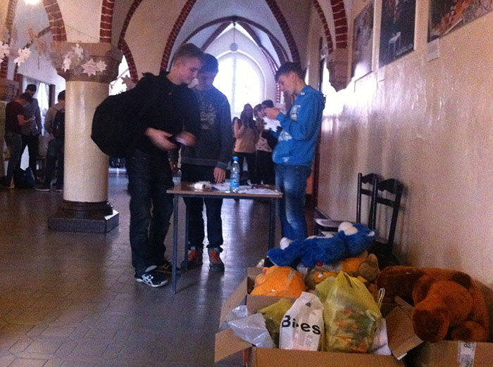 W dniach 3 oraz 4 grudnia w naszej szkole odbyła się Poczta Mikołajkowa organizowana przez klasę III A gimnazjum. Jednak tym razem działała ona na zupełnie innych zasadach. Zbieraliśmy bowiem zabawki oraz słodycze dla domu dziecka w Kętrzynie. W holu naszej szkoły na parterze można było wesprzeć akcję, przynosząc najróżniejsze podarunki, a także napisać życzenia świąteczne na papierowych śnieżynkach, które następnie były zawieszane między filarami. Na każdej przerwie uczniowie klasy III A dyżurowali przy stanowisku i prowadzili pocztę. Wyniki zbiórki przeszły nasze najśmielsze oczekiwania. Zebraliśmy aż 4 kartony słodyczy, pluszowych zabawek oraz gier planszowych. Przy wręczeniu prezentów pani dyrektor domu dziecka oraz jej podopieczni byli wyraźnie weseli i szczęśliwi. Wszystkim, którzy przynieśli prezenty, klasie IIIA oraz pani Katarzynie Sadowskiej bardzo serdecznie dziękujemy. Wesołych Świąt.