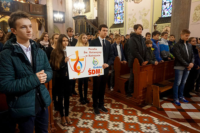 W kościele parafialnym św. Katarzyny w Kętrzynie społeczność naszej szkoły zgromadziła się na uroczystej Mszy Świętej, której przewodniczył ks. Roman Dąbkowski - kustosz symboli ŚDM w Archidiecezji Warmińskiej. Homilię wygłosił ks. Jarosław Dobrzeniecki - koordynator ŚDM w Archidiecezji Warmińskiej. Podkreślił w niej wartość Krzyża Chrystusowego w życiu młodego chrześcijanina. Wyjaśnił młodzieży, dlaczego krzyż jest znakiem miłości Boga do człowieka. Na zakończenie liturgii każdy mógł podejść do symboli i oddać im cześć, polecając Bogu swoje intencje modlitewne.